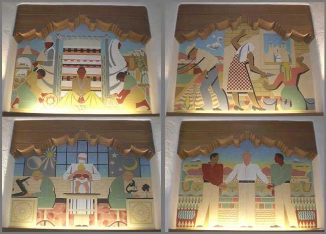 The long term solution is not clear from the website, but Mike Karim suggests that “the initial discussion was to apply a smart glass over each mural so as to present/project Native art, while preserving the integrity of the murals.” Depending on how the two images might be interrelated (if that is an option), it might represent a constructive retelling/overlaying of the history and the future.
